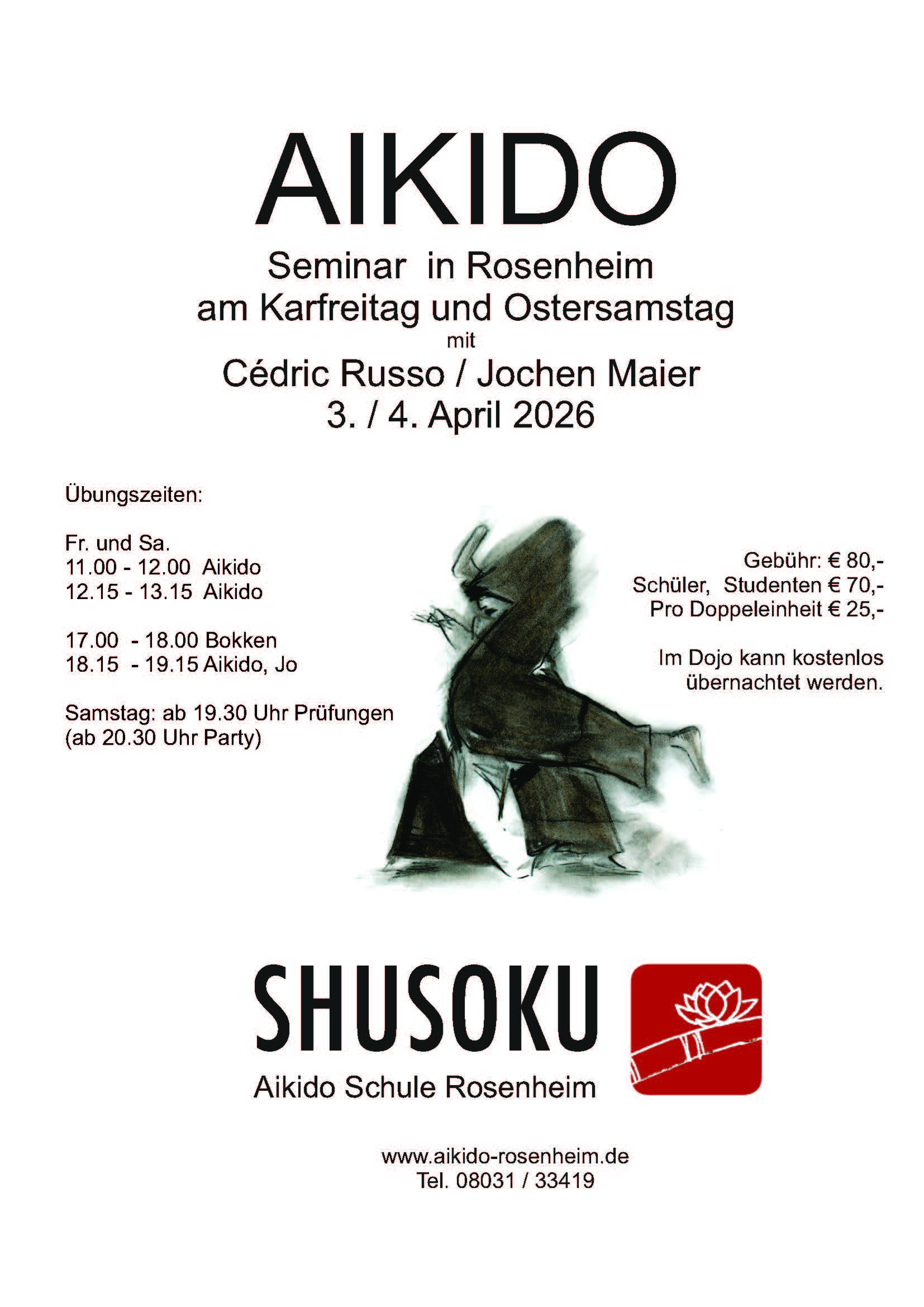 Shusoku Dojo in Rosenheim was founded by Jochen Maier, who presently holds 7th Dan Aikikai, Shihan. The dojo is situated in a heritage-protected part of a former brewery. Training started here in 1993, in a room with 108 square meters of tatami plus changing rooms. Today, the dojo can be used as a fully equipped seminar venue with overnight accommodation facilities. Over the years a full-sized kitchen, yoga studio, lounge, office, and even a balcony have been incorporated. In addition to regular classes, aikido seminars are held routinely at Shusoku Dojo.